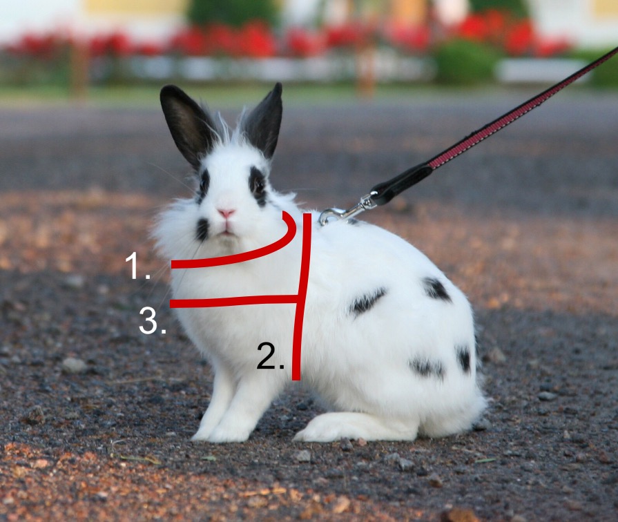 1. Kaulahihna: Mittaa mittanauhalla kanin kaulanympärys kaulan leveimmästä kohdasta.