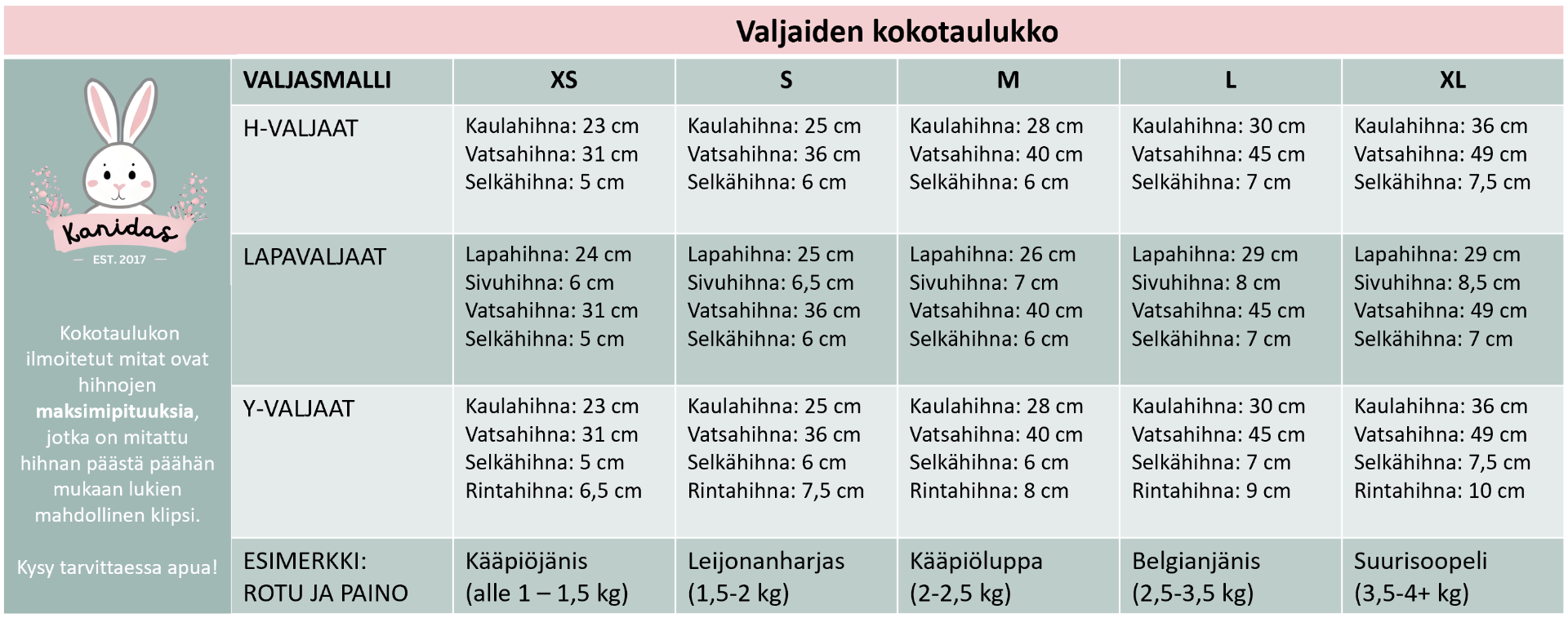 Valitse taulukosta sopivin koko tai tilaa mittatilausvaljaat kanisi omilla mitoilla!